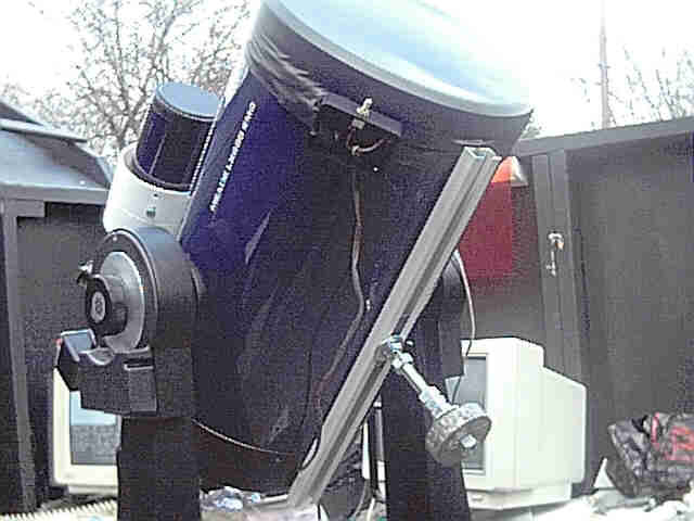 Detail of the counterweight and dew heater. Counterweight mount is made from track lighting rail, dew heater from nichrome wire shielded and wrapped around for about 22 watts. Power for heater comes from a 34AH Johnson Controls sealed lead/acid battery. In addition to the battery, a UPS was modified to use the Johnson as it's battery, so everything is also protected. Had not seen anyone do this, but with the price of UPS's being so low ($10 for the one I have after rebate), and considering you get surge, DC-AC conversion and slow charge (UPS had a 3AH battery) in one package, seemed like a good idea.