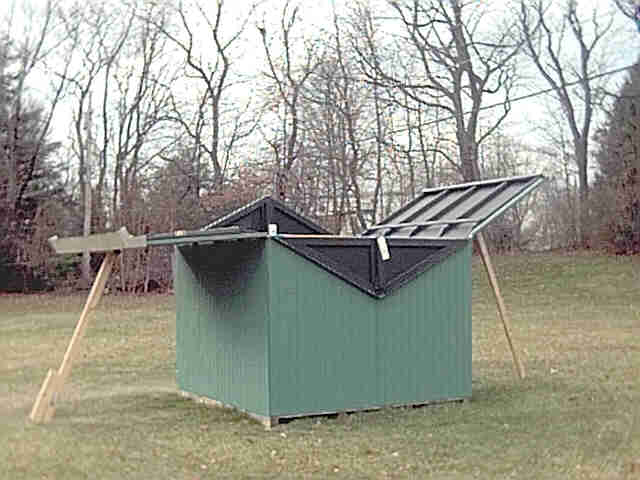 8 feet by 8 feet with 64 inch wall height (from inside floor) and 96 inches to the peak from the ground. No main power run from house yet, hence the yellow cord.